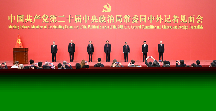 (10月23日,刚刚在中国共产党第二十届中央委员会第一次全体会议上当选的中共中央总书记习近平和中共中央政治局常委李强、赵乐际、王沪宁、蔡奇、丁薛祥、李希在北京人民大会堂同中外记者亲切见面。 新华社记者 申宏 摄)